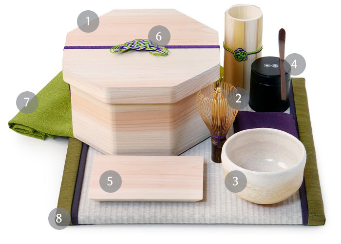 好きな場所で抹茶を飲むために、道具を木箱や篭に入れたものを茶箱といいます。八宝茶箱は「8人の作り手が生み出す 8つの宝物」を1つのセットにした、プレミアムな茶箱です。